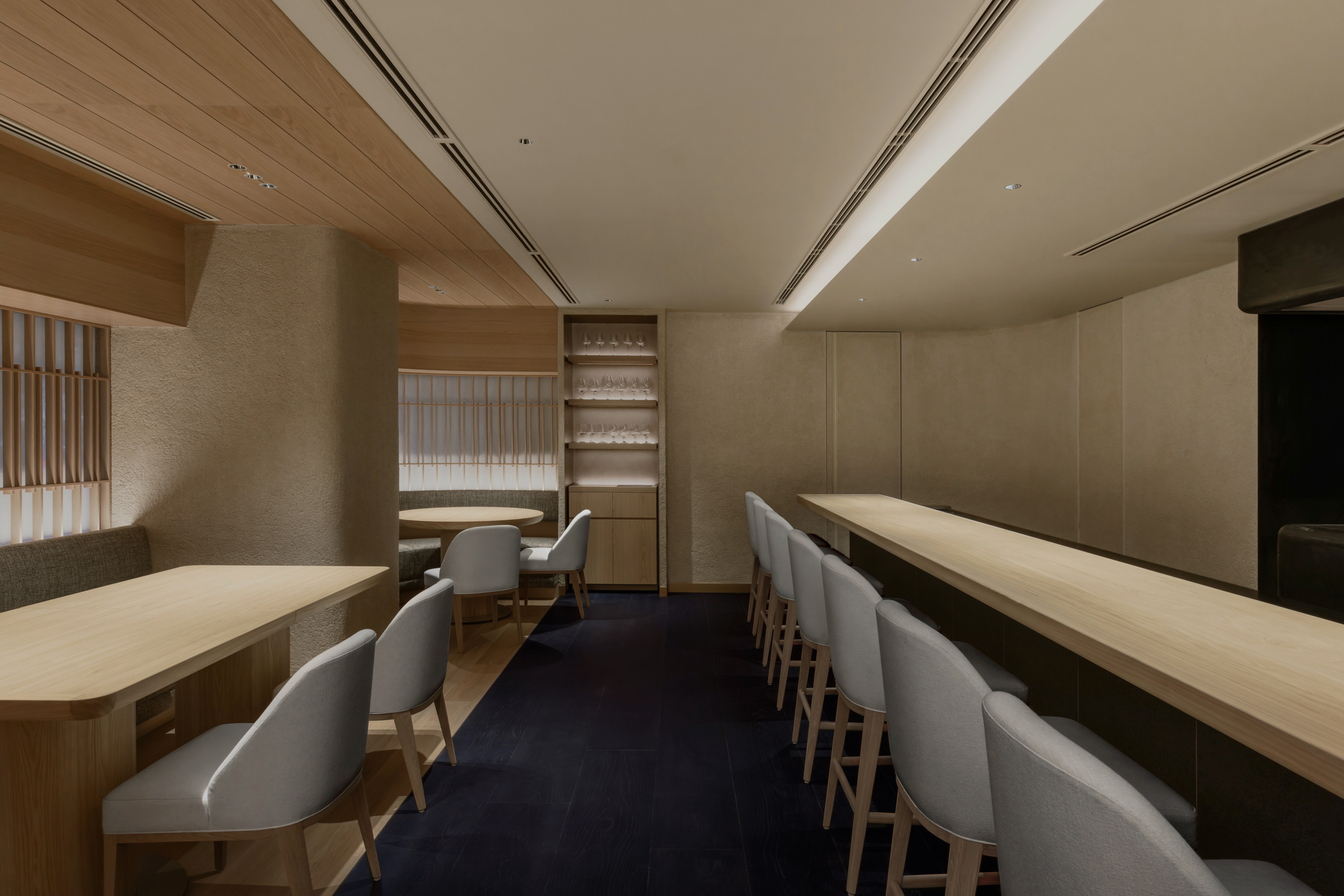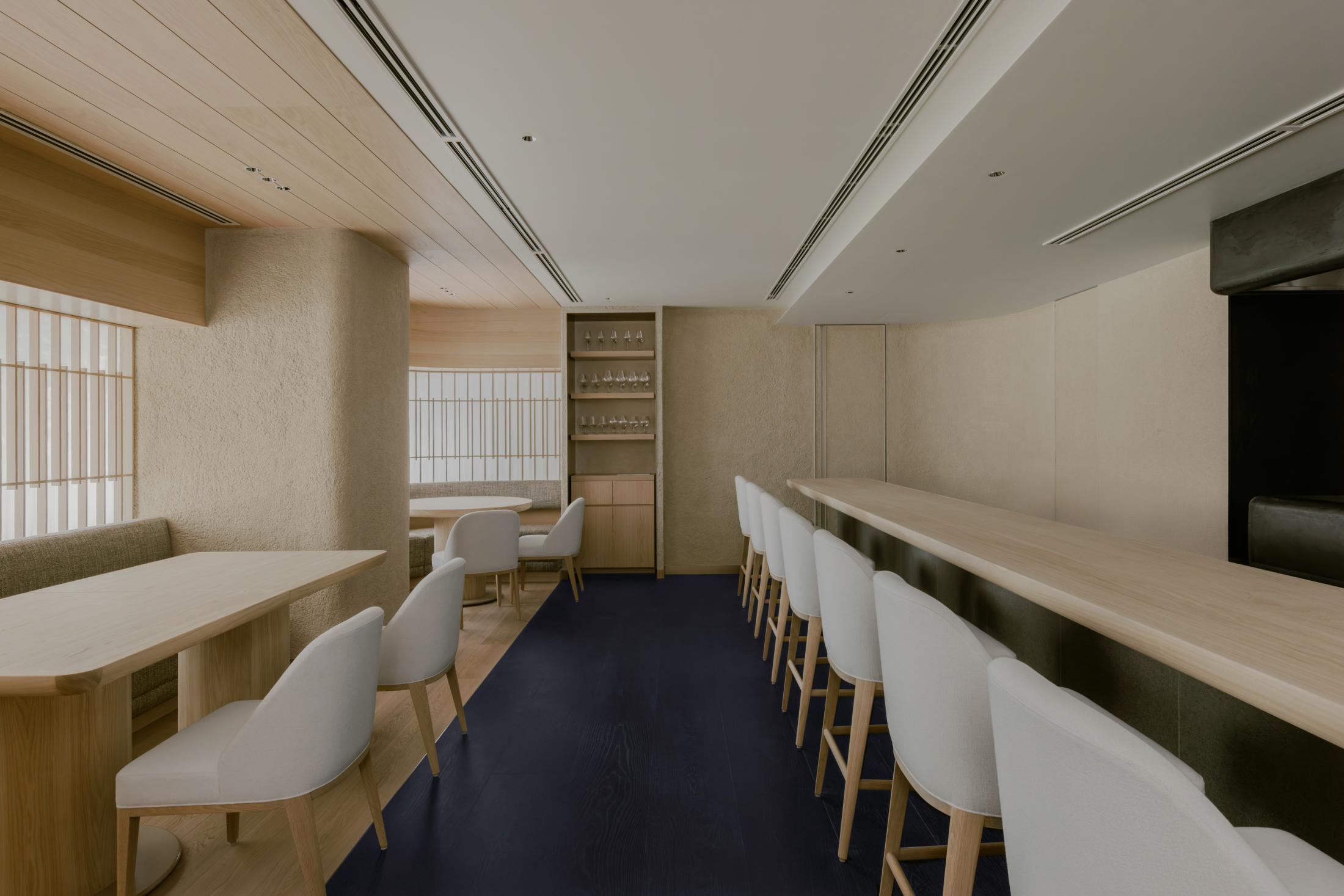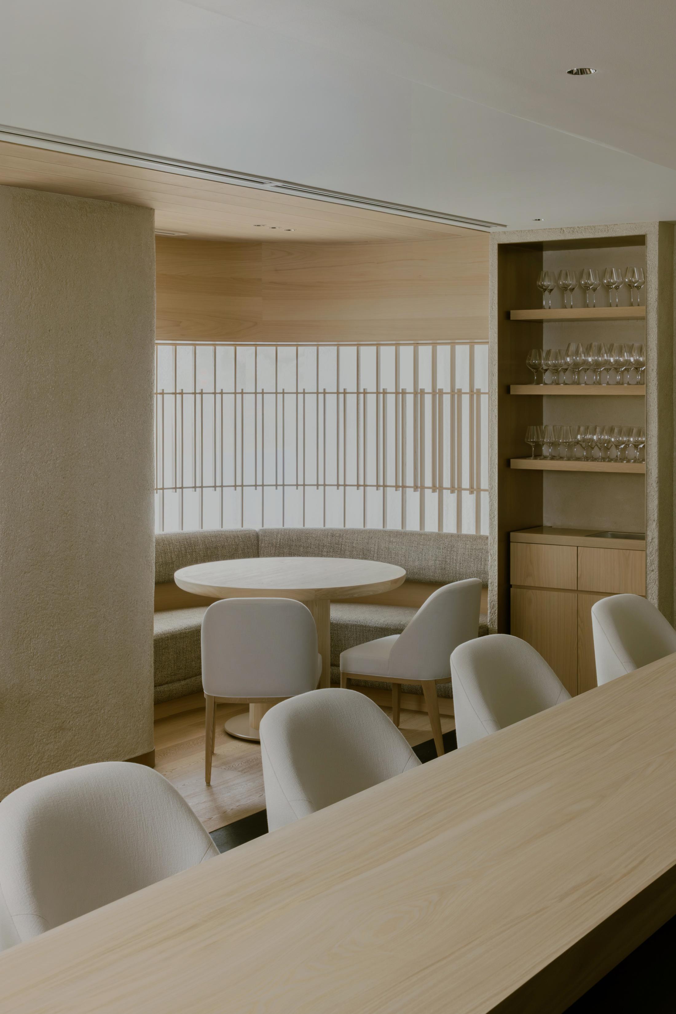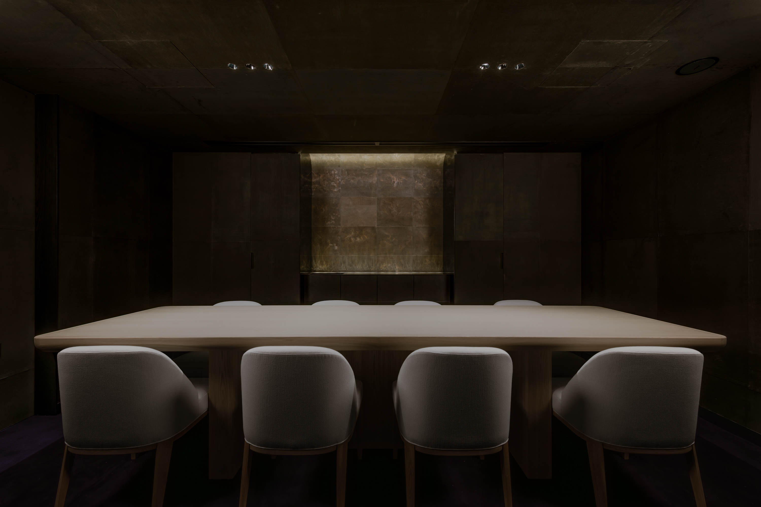 本計画地は、六本木通りに面した視覚的・聴覚的ノイズの多い都市環境に位置する。極めて高い情報密度と交通量を抱えるこの立地において、計画の主眼は、外部環境との物理的・心理的断絶をいかに構築するかにあった。空間の余白性の操作、音環境の制御、素材の選定、照度の調整、嗅覚的記憶など、多層的な設計手法を通じて、都市の時間感覚から切り離された濃度の高い空間を形成している。 本計画が内包する空間設計の軸には、レストラン「O」の名称に込められた複数の意味が通底している。フランス語で“水”を意味するEAU。もてなしの精神を示す応。そして、文字の形象としてのO=循環。これらの概念は、単なる象徴ではなく、空間の構成、素材の選定、細部の作法において具体的に反映した。 エントランスは、空間体験の出発点として、建築的な「間」の操作と感覚の初期化を担う装置である。同時にここは、食体験へと向かうための意識を静かに整え、感覚の解像度を上げていく「導入の間」として機能する。ブランドカラーのパープルに調色された特注の左官仕上げが壁面を包み、職人による手仕事が光の反射と陰影を繊細に変化させ、空間に呼吸を与えている。正面には無垢ガラスによるオブジェを配し、手水鉢や手水舎といった日本的な迎えの形式を抽象化して再構成。照明配置とガラス厚の計算によって、光の干渉がブランドロゴ「O」の形状を空間内に浮かび上がらせる設計となっている。さらに、齋藤智子氏が本計画のためにデザインしたオリジナルの香りを導入し、静けさとみずみずしさを嗅覚からも体験できるよう設計した。 ダイニングエリアでは、素材・スケール・ディテールに対して極度の精度が求められた。日本産の一枚板は、銘木屋で慎重に選定したセン材。腕が触れる位置に船底型の緩やかな面取りを施し、柔らかく身体を受け止めるよう設計。職人の手仕事によって角を落とした木口の処理は、水が石を削るような時間の蓄積を想起させ、触れた瞬間に素材の温度が伝わるよう意図している。椅子はROS STUDIOによる本計画のためのデザインで、背中を優しく包み込むような背面の曲率設計により、長時間の着座における身体負荷を軽減している。カウンター席のミドルハイチェアには、足掛けのレベルがカウンター側のステップと一致するよう設計。身体的ストレスを最小限に抑え、食と会話への集中を促す。 床材は、ブランドカラーを反映した特注の墨紫色フローリングを採用。黒の持つ硬質な印象を和らげつつも、空間全体の色調を統一し、精神的な落ち着きを醸成する役割を担う。この微妙な色彩操作は、空間全体に静的な調和をもたらし、来訪者の感覚を安定化させるとともに、ブランドのアイデンティティを静かに主張する。細部にわたり配慮した設計は、まさに「応(おもてなし)」の精神を空間に体現したものであり、訪れる者一人ひとりに対する気配りと尊重の形として機能している。 視線と光を制御するために窓面に設けた木製ルーバーとファブリックのレイヤーは、柔らかなモアレを生じさせながら、採光と視線の透過/遮蔽のバランスを取る。静的な構成のなかに動的な揺らぎを挿入することで、空間に微細な変化と呼吸が生まれるよう設計している。カウンター背面の左官壁には、アイボリーを基調とした特注左官仕上げを採用。その骨材には、オーナーである荻野屋から提供された、回収済みの釜飯の“釜”を粉砕し混入した。 廃材でありながら、循環性と物語性を内包する素材として、空間の一部へと取り込んでいる。 循環という思想は、素材の扱い全体に貫かれている。ダイニングテーブルの外周にはカウンターのセン材の端材を再利用し、無垢ガラスは再生しても性質の変わらない素材として、時間を超える透明性と循環性を象徴する存在となっている。空間に用いた素材は、単に意匠面の美を追求するだけではなく、使い切る、繰り返す、引き継ぐという考えのもとに配置した。 個室空間においては、壁面・天井面ともにハタノワタル氏による和紙施工。墨色の和紙の繊細な貼り分け技術が、空間に包容力を与え、閉じた環境ながらも呼吸するような質感を演出する。特注で調合された黄金および燻銀を微細に配合した色彩設計は、光の角度により多層的な表情を見せ、視覚的な深みと静けさを同時に喚起させる。照明設計は、木製テーブルの表面に照射を集中させることで、料理と会話への没入感を強化し、時間の流れを感覚的に緩やかに変容させる役割を果たしている。 廊下から続くパウダールームは、大理石で構成した特注手洗いカウンターおよび本計画専用に設計した壁面収納を備え、機能性と美観を高度に融合。ここでも細部のディテールに徹底的な検証を施し、素材の接合部、仕上げの均質性、ユーザビリティが最高水準で担保されている。プライベート空間としての安心感と、非日常への切り替えを促す静謐な環境が共存する。 本計画は、空