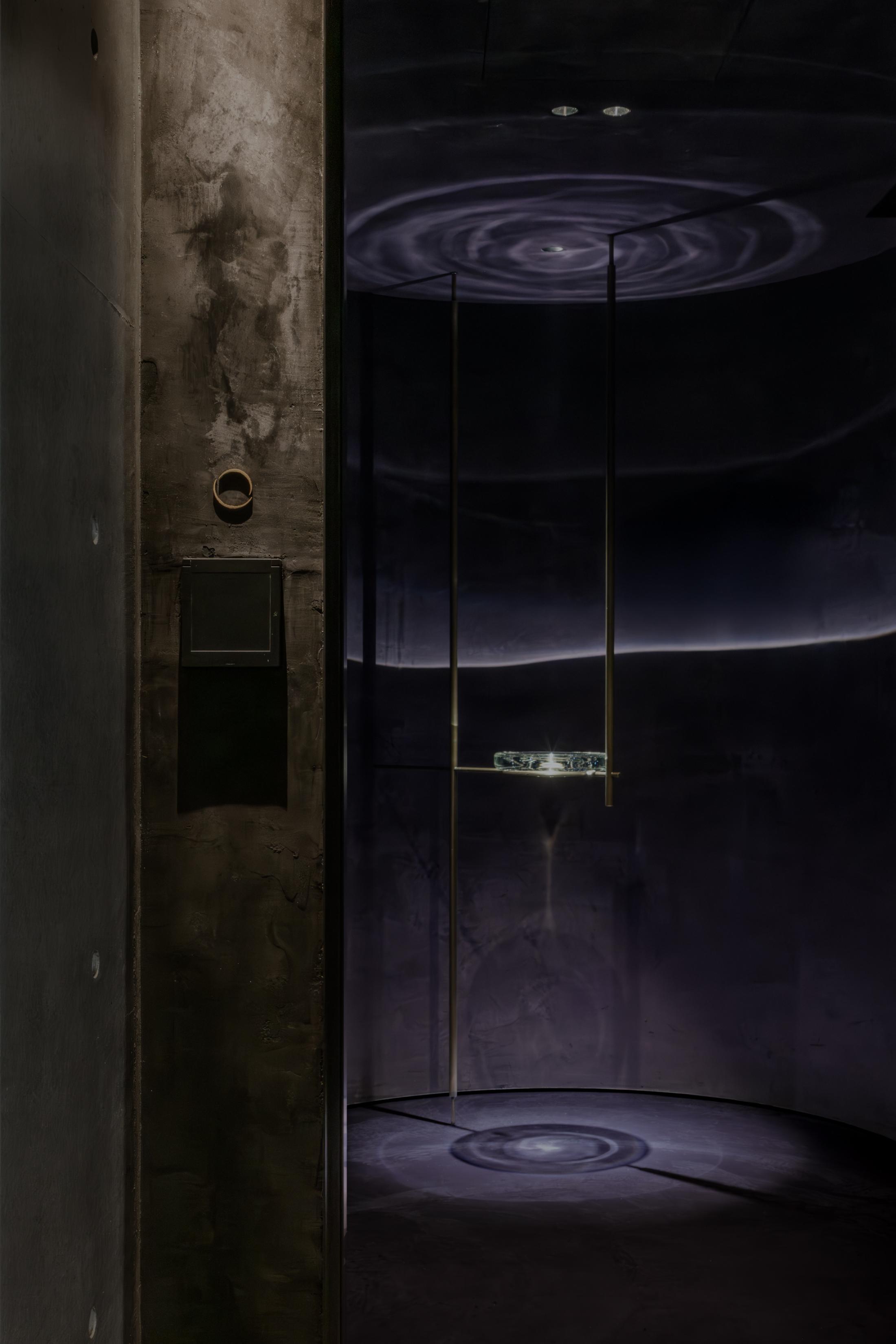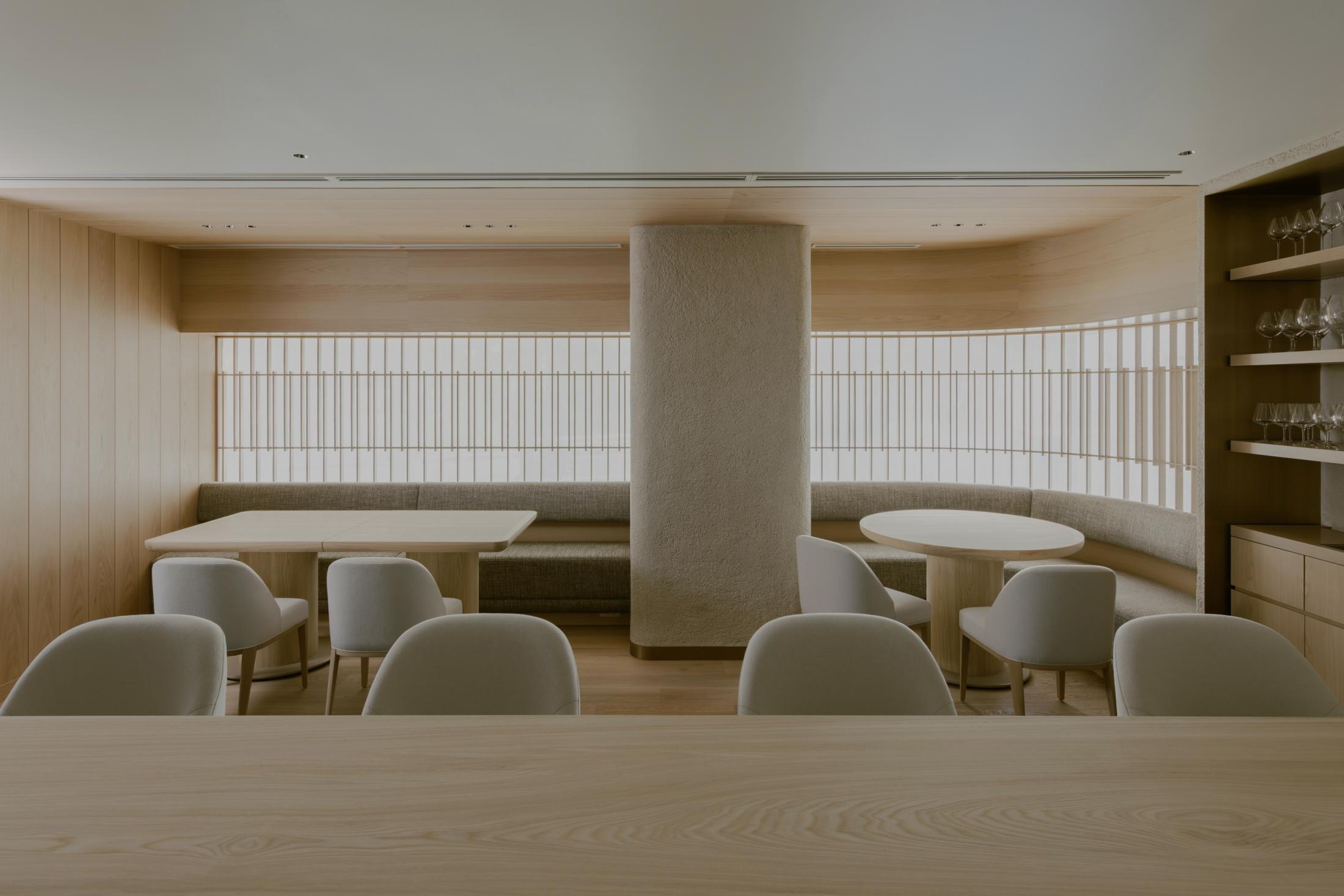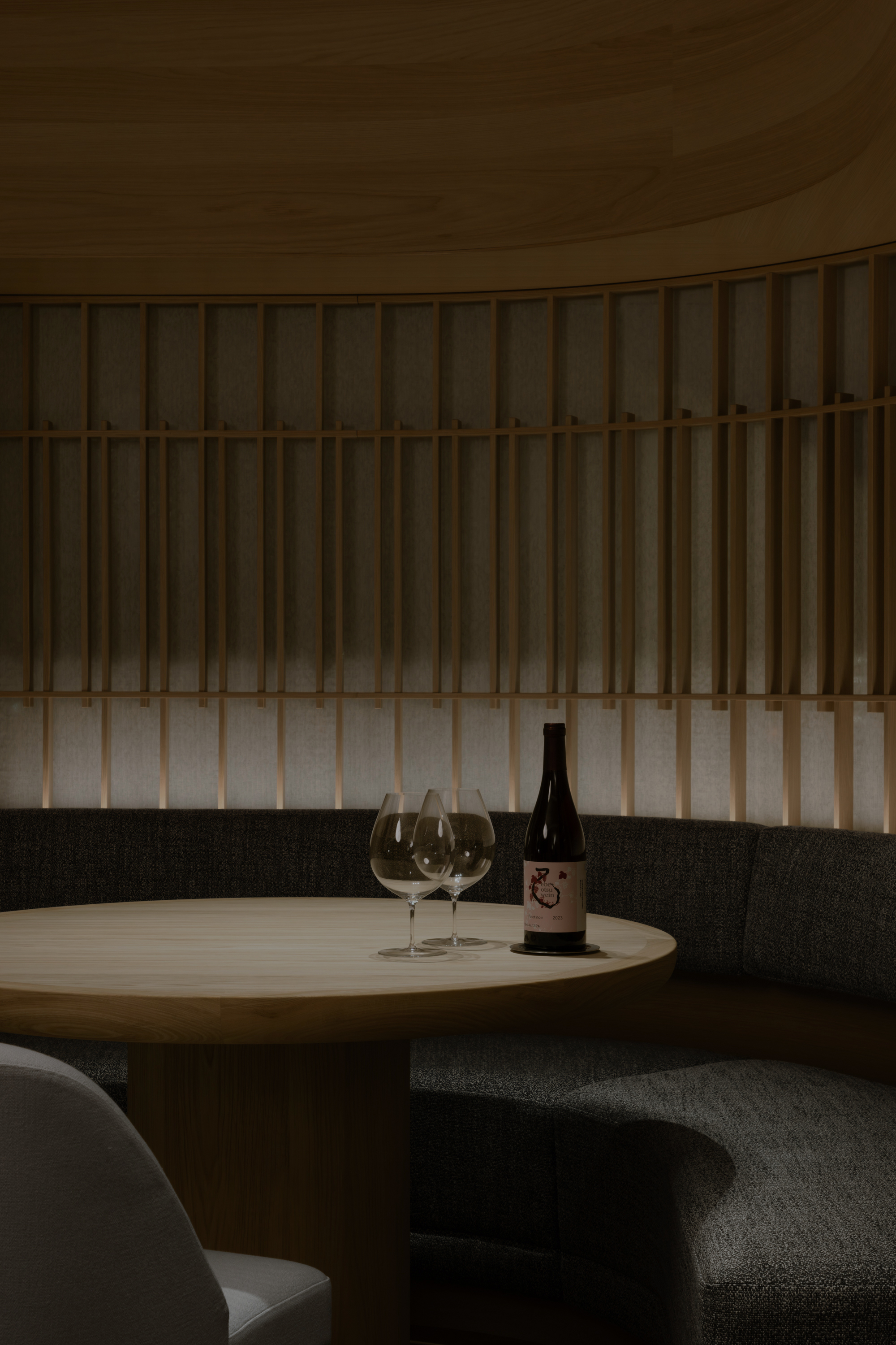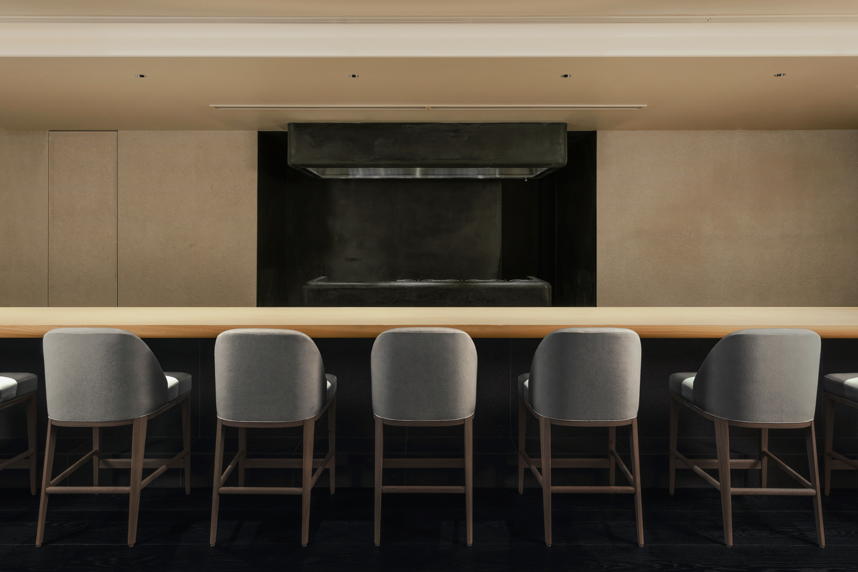 本計画地は、六本木通りに面した視覚的・聴覚的ノイズの多い都市環境に位置する。極めて高い情報密度と交通量を抱えるこの立地において、計画の主眼は、外部環境との物理的・心理的断絶をいかに構築するかにあった。空間の余白性の操作、音環境の制御、素材の選定、照度の調整、嗅覚的記憶など、多層的な設計手法を通じて、都市の時間感覚から切り離された濃度の高い空間を形成している。 本計画が内包する空間設計の軸には、レストラン「O」の名称に込められた複数の意味が通底している。フランス語で“水”を意味するEAU。もてなしの精神を示す応。そして、文字の形象としてのO=循環。これらの概念は、単なる象徴ではなく、空間の構成、素材の選定、細部の作法において具体的に反映した。 エントランスは、空間体験の出発点として、建築的な「間」の操作と感覚の初期化を担う装置である。同時にここは、食体験へと向かうための意識を静かに整え、感覚の解像度を上げていく「導入の間」として機能する。ブランドカラーのパープルに調色された特注の左官仕上げが壁面を包み、職人による手仕事が光の反射と陰影を繊細に変化させ、空間に呼吸を与えている。正面には無垢ガラスによるオブジェを配し、手水鉢や手水舎といった日本的な迎えの形式を抽象化して再構成。照明配置とガラス厚の計算によって、光の干渉がブランドロゴ「O」の形状を空間内に浮かび上がらせる設計となっている。さらに、齋藤智子氏が本計画のためにデザインしたオリジナルの香りを導入し、静けさとみずみずしさを嗅覚からも体験できるよう設計した。 ダイニングエリアでは、素材・スケール・ディテールに対して極度の精度が求められた。日本産の一枚板は、銘木屋で慎重に選定したセン材。腕が触れる位置に船底型の緩やかな面取りを施し、柔らかく身体を受け止めるよう設計。職人の手仕事によって角を落とした木口の処理は、水が石を削るような時間の蓄積を想起させ、触れた瞬間に素材の温度が伝わるよう意図している。椅子はROS STUDIOによる本計画のためのデザインで、背中を優しく包み込むような背面の曲率設計により、長時間の着座における身体負荷を軽減している。カウンター席のミドルハイチェアには、足掛けのレベルがカウンター側のステップと一致するよう設計。身体的ストレスを最小限に抑え、食と会話への集中を促す。 床材は、ブランドカラーを反映した特注の墨紫色フローリングを採用。黒の持つ硬質な印象を和らげつつも、空間全体の色調を統一し、精神的な落ち着きを醸成する役割を担う。この微妙な色彩操作は、空間全体に静的な調和をもたらし、来訪者の感覚を安定化させるとともに、ブランドのアイデンティティを静かに主張する。細部にわたり配慮した設計は、まさに「応(おもてなし)」の精神を空間に体現したものであり、訪れる者一人ひとりに対する気配りと尊重の形として機能している。 視線と光を制御するために窓面に設けた木製ルーバーとファブリックのレイヤーは、柔らかなモアレを生じさせながら、採光と視線の透過/遮蔽のバランスを取る。静的な構成のなかに動的な揺らぎを挿入することで、空間に微細な変化と呼吸が生まれるよう設計している。カウンター背面の左官壁には、アイボリーを基調とした特注左官仕上げを採用。その骨材には、オーナーである荻野屋から提供された、回収済みの釜飯の“釜”を粉砕し混入した。 廃材でありながら、循環性と物語性を内包する素材として、空間の一部へと取り込んでいる。 循環という思想は、素材の扱い全体に貫かれている。ダイニングテーブルの外周にはカウンターのセン材の端材を再利用し、無垢ガラスは再生しても性質の変わらない素材として、時間を超える透明性と循環性を象徴する存在となっている。空間に用いた素材は、単に意匠面の美を追求するだけではなく、使い切る、繰り返す、引き継ぐという考えのもとに配置した。 個室空間においては、壁面・天井面ともにハタノワタル氏による和紙施工。墨色の和紙の繊細な貼り分け技術が、空間に包容力を与え、閉じた環境ながらも呼吸するような質感を演出する。特注で調合された黄金および燻銀を微細に配合した色彩設計は、光の角度により多層的な表情を見せ、視覚的な深みと静けさを同時に喚起させる。照明設計は、木製テーブルの表面に照射を集中させることで、料理と会話への没入感を強化し、時間の流れを感覚的に緩やかに変容させる役割を果たしている。 廊下から続くパウダールームは、大理石で構成した特注手洗いカウンターおよび本計画専用に設計した壁面収納を備え、機能性と美観を高度に融合。ここでも細部のディテールに徹底的な検証を施し、素材の接合部、仕上げの均質性、ユーザビリティが最高水準で担保されている。プライベート空間としての安心感と、非日常への切り替えを促す静謐な環境が共存する。 本計画は、空