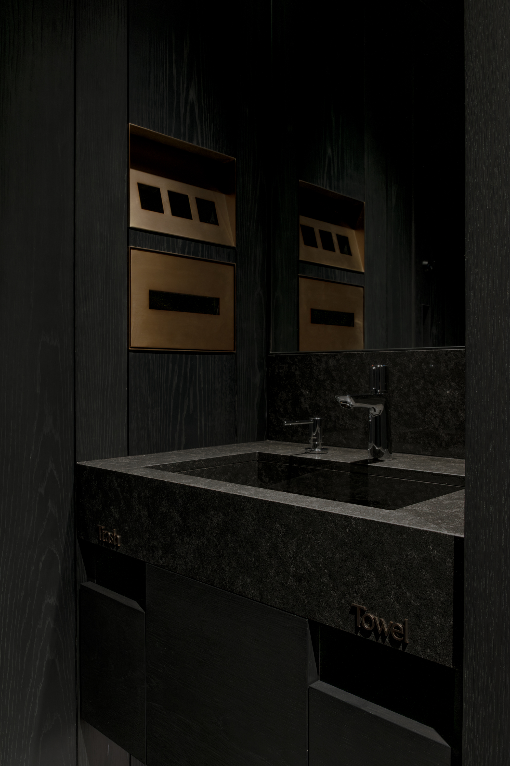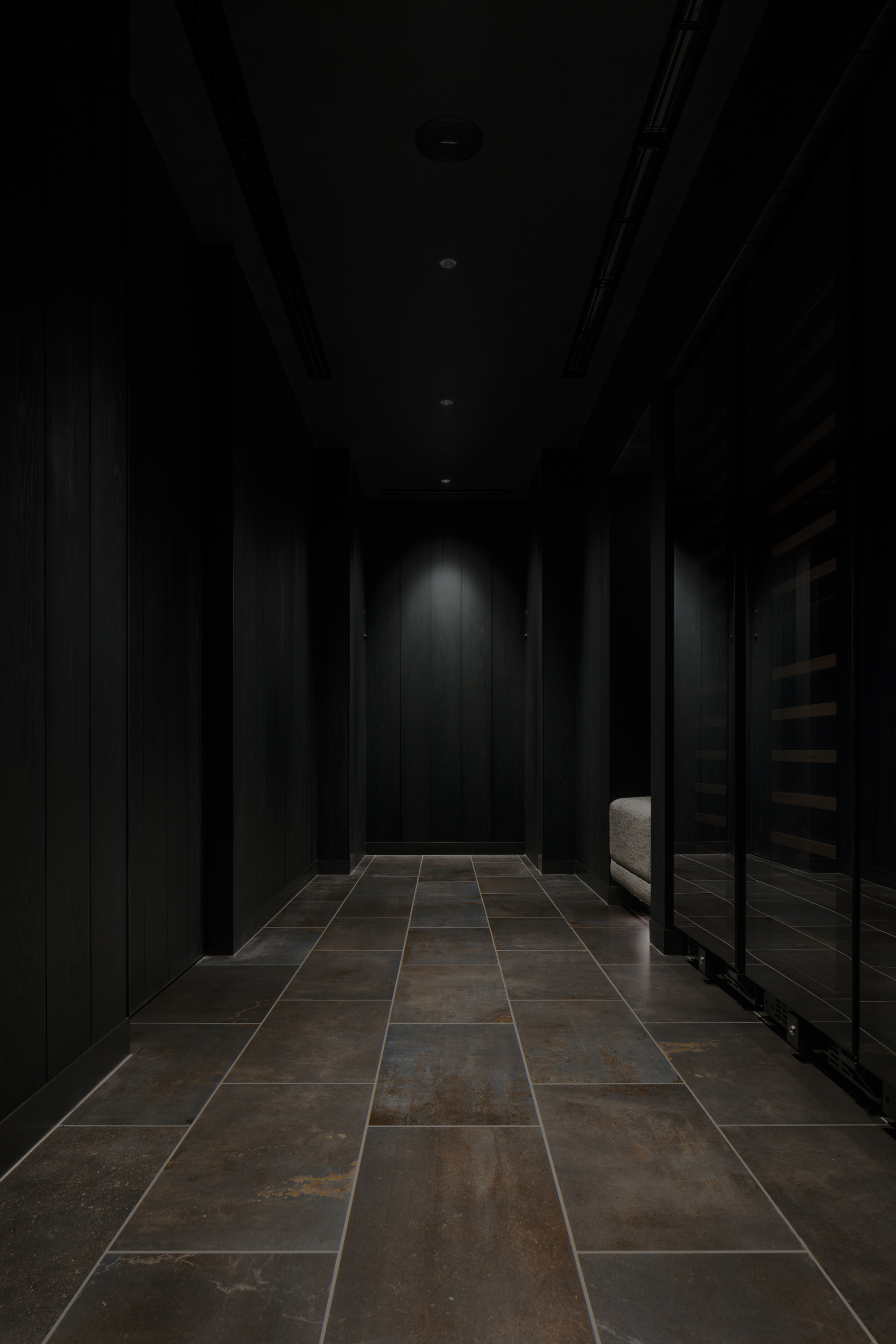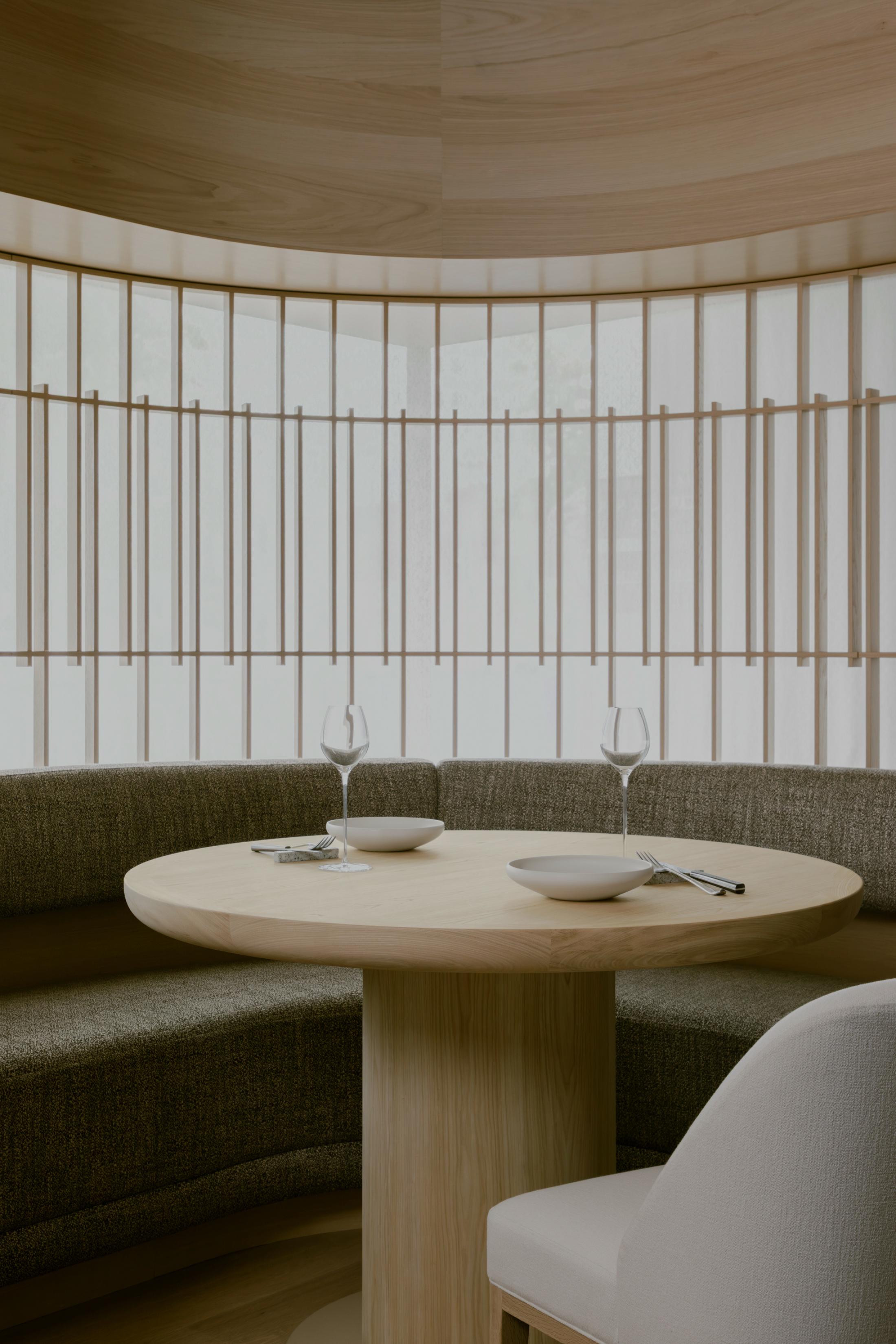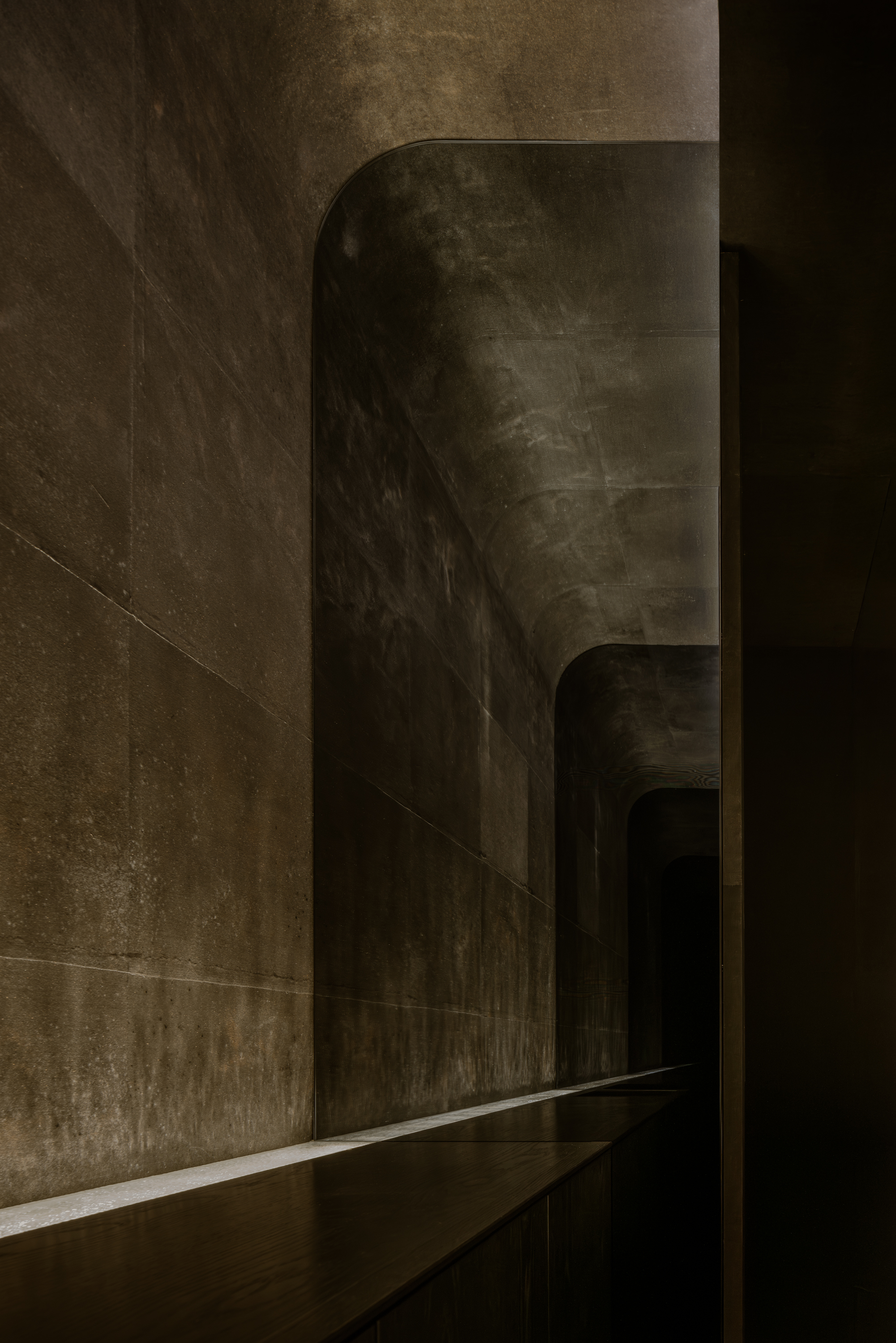 本計画地は、六本木通りに面した視覚的・聴覚的ノイズの多い都市環境に位置する。極めて高い情報密度と交通量を抱えるこの立地において、計画の主眼は、外部環境との物理的・心理的断絶をいかに構築するかにあった。空間の余白性の操作、音環境の制御、素材の選定、照度の調整、嗅覚的記憶など、多層的な設計手法を通じて、都市の時間感覚から切り離された濃度の高い空間を形成している。 本計画が内包する空間設計の軸には、レストラン「O」の名称に込められた複数の意味が通底している。フランス語で“水”を意味するEAU。もてなしの精神を示す応。そして、文字の形象としてのO=循環。これらの概念は、単なる象徴ではなく、空間の構成、素材の選定、細部の作法において具体的に反映した。 エントランスは、空間体験の出発点として、建築的な「間」の操作と感覚の初期化を担う装置である。同時にここは、食体験へと向かうための意識を静かに整え、感覚の解像度を上げていく「導入の間」として機能する。ブランドカラーのパープルに調色された特注の左官仕上げが壁面を包み、職人による手仕事が光の反射と陰影を繊細に変化させ、空間に呼吸を与えている。正面には無垢ガラスによるオブジェを配し、手水鉢や手水舎といった日本的な迎えの形式を抽象化して再構成。照明配置とガラス厚の計算によって、光の干渉がブランドロゴ「O」の形状を空間内に浮かび上がらせる設計となっている。さらに、齋藤智子氏が本計画のためにデザインしたオリジナルの香りを導入し、静けさとみずみずしさを嗅覚からも体験できるよう設計した。 ダイニングエリアでは、素材・スケール・ディテールに対して極度の精度が求められた。日本産の一枚板は、銘木屋で慎重に選定したセン材。腕が触れる位置に船底型の緩やかな面取りを施し、柔らかく身体を受け止めるよう設計。職人の手仕事によって角を落とした木口の処理は、水が石を削るような時間の蓄積を想起させ、触れた瞬間に素材の温度が伝わるよう意図している。椅子はROS STUDIOによる本計画のためのデザインで、背中を優しく包み込むような背面の曲率設計により、長時間の着座における身体負荷を軽減している。カウンター席のミドルハイチェアには、足掛けのレベルがカウンター側のステップと一致するよう設計。身体的ストレスを最小限に抑え、食と会話への集中を促す。 床材は、ブランドカラーを反映した特注の墨紫色フローリングを採用。黒の持つ硬質な印象を和らげつつも、空間全体の色調を統一し、精神的な落ち着きを醸成する役割を担う。この微妙な色彩操作は、空間全体に静的な調和をもたらし、来訪者の感覚を安定化させるとともに、ブランドのアイデンティティを静かに主張する。細部にわたり配慮した設計は、まさに「応(おもてなし)」の精神を空間に体現したものであり、訪れる者一人ひとりに対する気配りと尊重の形として機能している。 視線と光を制御するために窓面に設けた木製ルーバーとファブリックのレイヤーは、柔らかなモアレを生じさせながら、採光と視線の透過/遮蔽のバランスを取る。静的な構成のなかに動的な揺らぎを挿入することで、空間に微細な変化と呼吸が生まれるよう設計している。カウンター背面の左官壁には、アイボリーを基調とした特注左官仕上げを採用。その骨材には、オーナーである荻野屋から提供された、回収済みの釜飯の“釜”を粉砕し混入した。 廃材でありながら、循環性と物語性を内包する素材として、空間の一部へと取り込んでいる。 循環という思想は、素材の扱い全体に貫かれている。ダイニングテーブルの外周にはカウンターのセン材の端材を再利用し、無垢ガラスは再生しても性質の変わらない素材として、時間を超える透明性と循環性を象徴する存在となっている。空間に用いた素材は、単に意匠面の美を追求するだけではなく、使い切る、繰り返す、引き継ぐという考えのもとに配置した。 個室空間においては、壁面・天井面ともにハタノワタル氏による和紙施工。墨色の和紙の繊細な貼り分け技術が、空間に包容力を与え、閉じた環境ながらも呼吸するような質感を演出する。特注で調合された黄金および燻銀を微細に配合した色彩設計は、光の角度により多層的な表情を見せ、視覚的な深みと静けさを同時に喚起させる。照明設計は、木製テーブルの表面に照射を集中させることで、料理と会話への没入感を強化し、時間の流れを感覚的に緩やかに変容させる役割を果たしている。 廊下から続くパウダールームは、大理石で構成した特注手洗いカウンターおよび本計画専用に設計した壁面収納を備え、機能性と美観を高度に融合。ここでも細部のディテールに徹底的な検証を施し、素材の接合部、仕上げの均質性、ユーザビリティが最高水準で担保されている。プライベート空間としての安心感と、非日常への切り替えを促す静謐な環境が共存する。 本計画は、空